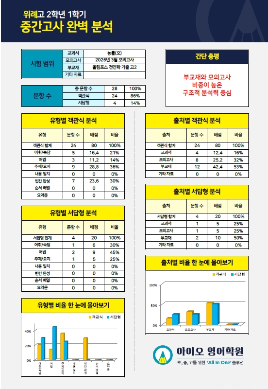 안녕하세요, 아이오 영어학원 위례점입니다. 이번 위례고 2학년 중간고사는 부교재와 모의고사 비중이 높은 구조적 분석력 중심 시험이었습니다. 1. 이번 위례고 1학년 영어 시험 간단 총평 및 난이도 이번 위례고 2학년 중간고사는 교과서와 모의고사 일부 문항은 비교적 평이하게 출제되어 기본 점수 확보는 용이했으나, 부교재 중심의 빈칸 완성 및 어법 영역에서 고난이도 문항이 집중되어 있습니다. 서술형 문제는 지문의 핵심 소재를 정확한 어법으로 서술하는 형식으로 최상위 등급을 결정 짓는 요소였습니다. 심화 지문의 구조적 이해와 서술형 영작의 정밀함을 동시에 요구하는 변별 중심의 시험이었습니다. 2. 객관식 출제 경향 어휘/속....... <img src="https://blogthumb.pstatic.net/MjAyNjA0MjRfMTY4/MDAxNzc3MDMzODQ1MDkx.DMGuUU-sh-CR3YOFR34KEeb00UksFGtxLBGh2bSUe6Ug.zX6PzU927pt0VH5G99XXqyoc5_BYxJKiy84Gg0URXj4g.JPEG/%C0%A7%B7%CA%B0%ED2%C1%DF%B0%A3%B0%ED%BB%E7%B3%BB%BD%C5%BA%D0%BC%AE_%C0%A7%B7%CA%BF%B5%BE%EE%C7%D0%BF%F8.jpg?type=s3" />