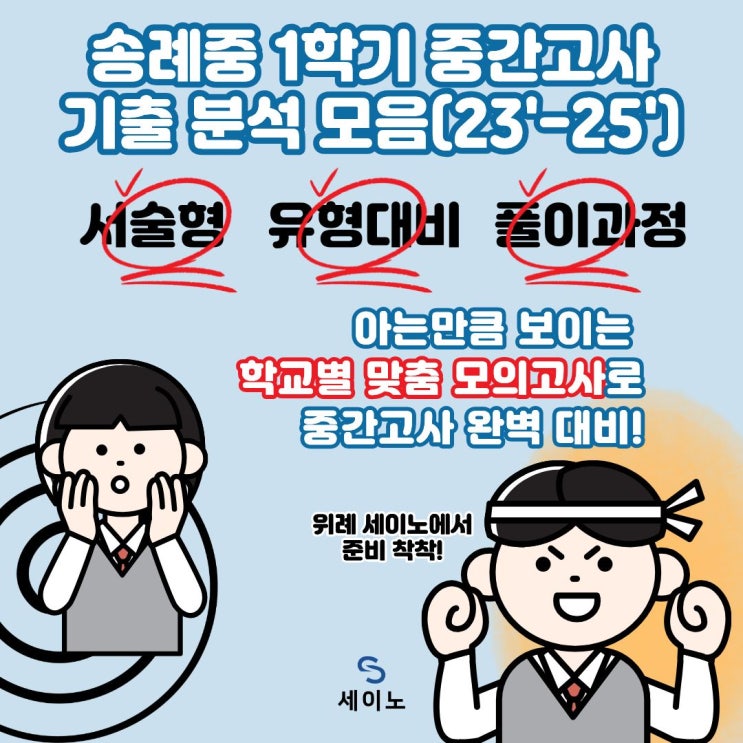 송례중수학학원 대치세이노 위례점 안녕하세요. 송례중 수학학원 대치세이노 위례점입니다. 오늘은 송례중학교 최근 3개년 수학 기출 모음입니다. 2-3학년 모두 전반적인 난도가 높지는 않으나 서술형 문항 비중이 높아 관련 연습이 절대적으로 필요! 그리고 기말고사의 난도는 여지없이 올라간다. 송례중학교 수학 시험의 최근 출제 경향을 압축해보자면 계산 자체가 복잡하거나 크게 변형된 문제 유형이 거의 없는 반면, 전체 문항수와 서술형이 많아 몰라서 못 푸는 문제보다 시간 배분이 발목을 잡는 경우가 있어 OMR에 옮기는 시간 포함, 타임어택 훈련이 필요하다는 점! 입니다. 또 하나, 그렇다고 1학기 중간고사 기출 난이도에 비추어 내....... <img src="https://blogthumb.pstatic.net/MjAyNjA0MjRfMjg4/MDAxNzc3MDE2NjM0NzA0.TWkXy7uh3_Phs9lbwitXZBRXNClT-TzRRmvh0cdEJQkg.wstsmqgjFGUQa7i2pEV27OpyCHFp40GnL7kdPuhg2p8g.JPEG/%BC%DB%B7%CA%C1%DF%BC%F6%C7%D0%B8%F0%C0%C7%B0%ED%BB%E7.jpg?type=s3" />