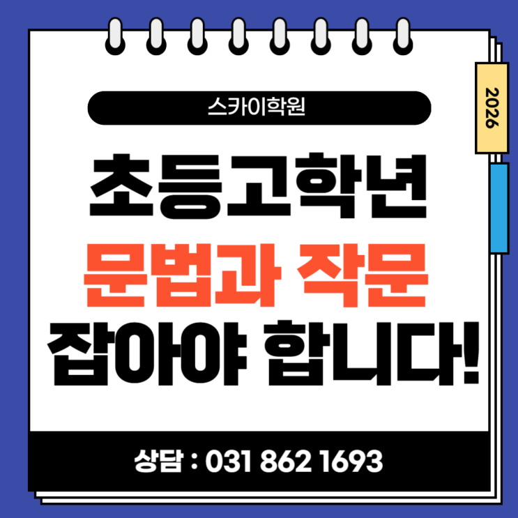 안녕하세요! 스카이 학원입니다! 우리 아이 영어 공부, 학년이 올라갈수록 고민이 깊어지시죠? 특히나 요즘에는 초등 고학년들이 문법과 작문을 소홀히 하면 중 고등부에 올라가서 많은 낭태를 볼 수 있어서 더욱 중요합니다! 중등부 영어 내신을 진행하면 그러한 현실을 조금 더 확실하게 느낄 수 있을 것이라 생각이 듭니다! 그럼 구체적으로 스카이 학원 영어학습에서 문법과 작문에 많은 노력을 기울이는 이유가 뭘까요? 첫째, 중·고등부 내신에서 서술형의 비중이 압도적으로 높아지고 있기 때문입니다. 이제 단순히 객관식 문제를 잘 푸는 것만으로는 상위권 등급을 유지하기 어렵습니다. 현재 중 고등부 내신 서술형은 대부분 문법과 작문....... <img src="https://blogthumb.pstatic.net/MjAyNjA0MjZfMjM0/MDAxNzc3MTk2MTcxNDMx.iod232TuBPxi3ZIR5Hb8rdabXSYlFlymz99vqyY7lJAg.ZLJ-qcOU_XFrUpcKtuk8Yj5HSGDbbP1D9pTbMtuHnkEg.PNG/%C5%AC%B6%F3%C0%CC%B0%ED%C7%D0%B3%E2%B9%AE%B9%FD%B0%FA%C0%DB%B9%AE-001_%287%29.png?type=s3" />