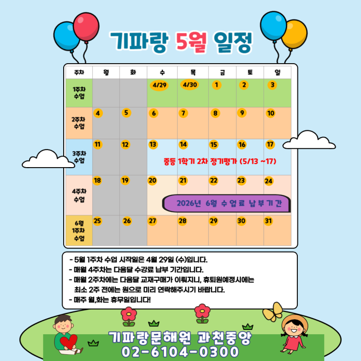 안녕하세요. 기파랑문해원 과천중앙원입니다. 다가오는 5월 일정 공지해 드리려고 합니다. 감사합니다. 추가 문의 사항은 과천중앙원으로 연락 부탁 드립니다. <img src="https://blogthumb.pstatic.net/MjAyNjA0MjVfMjEx/MDAxNzc3MTAwNDk0NDg2.IBPJXTFn5IbVPl4ryAC8VXEXeBuxEk77hnXEU3pg4KUg.T8l5v6BV8xE10qkBLktm4UQipiUAeApam5OjJXoO5rYg.PNG/2025_%B1%E2%C6%C4%B6%FB_%C0%CF%C1%A4%C7%A5-008.png?type=s3" />
