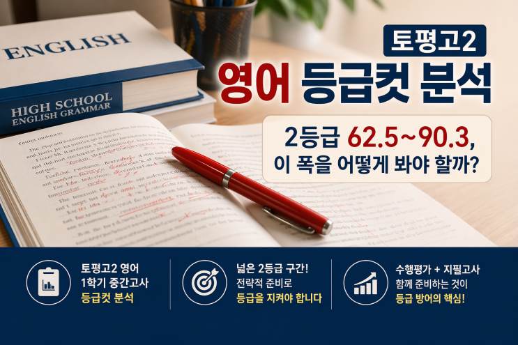 토평고 영어학원 피티엠이 분석한 5등급제 영어 점수 구조 토평고 영어, 2등급 폭이 넓을 때 반드시 세워야 할 내신 전략 토평고2 영어 1학기 중간고사 등급컷, 무엇을 봐야 할까요? 토평고2 영어 1학기 중간고사 등급컷을 보면 이번 시험의 특징이 꽤 명확하게 드러나요. 단순히 점수만 보는 것이 아니라, 시험 난이도와 학생 분포까지 함께 읽는 것이 중요해요. 이번 등급컷은 다음과 같이 형성되었어요. 1등급: 90.4 ~ 100 2등급: 62.5 ~ 90.3 3등급: 34.8 ~ 62.4 4등급: 21.5 ~ 34.7 5등급: 21.4 이하 토평고 영어, 왜 2등급 점수 폭이 이렇게 넓을까요? 이번 시험에서 가장 눈에 띄는 부분은 2등급 구간이에요. 무려 62.5점부터 90.3점까지....... <img src="https://blogthumb.pstatic.net/MjAyNjA0MjRfMyAg/MDAxNzc3MDMyODQ2NDAw.V_aUiipeBP0JYuUmZyPdoHVofkqwCurOoZCFR-Bv1zUg.e91qPYPyM6X7hQK48HntwnO3zN90RsASoFZa0Dyj4g8g.PNG/%C5%E4%C6%F2%B0%ED%C0%CC%B9%CC%C1%F61.png?type=s3" />