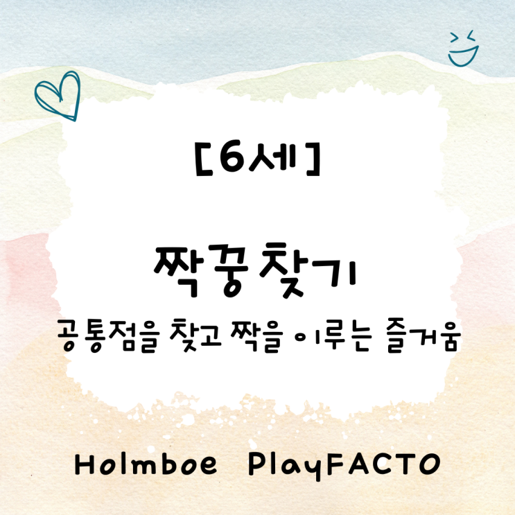 6세 - 공통점을 찾고 짝을 이루는 즐거움 《짝꿍 찾기》 안녕하세요! 놀면서 배우는 수학, 구리시 인창동 홀름보에 플레이팩토입니다! 이번 6세 수업에서는 아이들과 함께 먼저 ‘분류’와 ‘공통점’의 개념을 알아보았습니다. 사물들이 어떤 점에서 같은지를 기준으로 나누어 보며 관찰력과 사고력을 키우는 시간을 가졌습니다. 이후에는 게임 활동을 통해 자신이 가진 칩과 공통점이 있는 짝꿍 칩을 찾아보는 활동을 진행했습니다. 어떤 점이 같은지 스스로 생각하고 비교하는 과정에서 아이들은 자연스럽게 분류의 기준을 이해하게 되었고, 친구들과 함께 소통하며 즐겁게 활동에 참여하는 모습도 볼 수 있었습니다. 이처럼 놀이 속에서 아이....... <img src="https://blogthumb.pstatic.net/MjAyNjA0MjVfMjQ3/MDAxNzc3MDk5Mzc3MjA1.MnK24OadKLQKZIJk815miuX4xELsnkfhOykW9UIQUtEg.mqCL3DkR9UHC1zn9iIa2P3RqHHgswRcATOY0UtbQ540g.PNG/%BD%E6%B3%D7%C0%CF_%BC%F6%BE%F7%281%B0%FC%29.png?type=s3" />