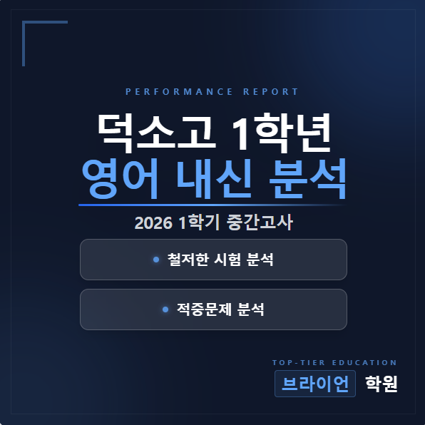 "서술형 없는 100% 선택형, 독해의 힘이 갈랐다" 안녕하세요! 영어 성적의 기준, 브라이언 영어입니다. 최근 치러진 덕소고 1학년 1학기 첫 중간고사 영어 시험에 대한 정밀 분석 결과를 공유합니다. 고등학교 입학 후 첫 시험인 만큼, 이번 출제 경향을 정확히 파악해야 다음 기말고사(2차 지필평가)에서 확실한 승기를 잡을 수 있습니다. 전반부 카드뉴스는 개괄적인 내용을 담고 있습니다. 시험 문제의 상세한 해설이 필요한 학생은 후반부 문항별 분석과 시험지를 대조해서 보세요. 카드뉴스로 한눈에 보기 1. 시험 개요 및 총평 이번 덕소고 1학년 시험은 한마디로 **'독해의 논리력'**을 묻는 시험이었습니다. 문항 구....... <img src="https://blogthumb.pstatic.net/MjAyNjA0MjZfMjU0/MDAxNzc3MTg1MjI3NDIx.W_NUVFowl6MOri1Hhkhapl10eyXDHiw1p4w4wdAeCjog.5zFMPeLdo2SB5SuKqKOZZAqqtzyqhPTN5U1jdZHvoX0g.PNG/image.png?type=s3" />