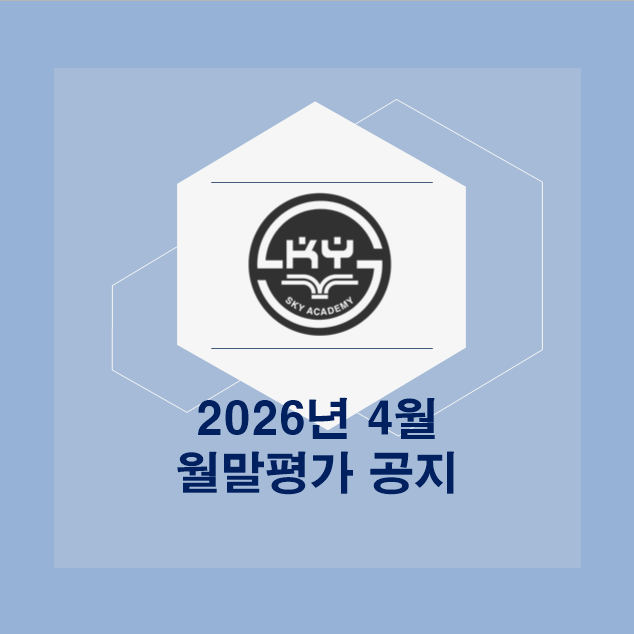 케이투스카이학원 2026년 4월 월말평가 공지 안녕하세요 케이투스카이학원입니다. 4월 월말평가 일정 안내 드리오니 참고 부탁드립니다 :) ● 날짜 : 3월 30일, 3월 31일 ● 대상 : 초,중등부 재원생 전원 ● 시간 : 초등부는 수업 시간, 중등부는 당일 튜터 수업 시간 내 고등부는 내신대비 일정으로 제외 월말평가는 지난 한 달간의 학습 내용을 기반으로 총 25문항으로 출제됩니다. 학생 개인의 학습 상황을 파악하고, 정규 상담 시 핵심 자료로 활용하기 위해 결과가 저장됩니다. 평가 이후에는 담당 선생님의 코멘트가 포함된 성적표를 개별 카톡으로 발송해드립니다. 또한, 월말평가 결과를 바탕으로 다음 학기 레벨업 여부가 결정 되오니....... <img src="https://blogthumb.pstatic.net/MjAyNjA0MjNfMjEg/MDAxNzc2OTMwMDgxMjA2.apa9KEX7RU67efvk6nuJmgE6C20F7qNDZU4dyXo32hAg.vcnLiDJvPLM1yaxopyrQL0kdaaddKiSCNDtNfY0eTngg.PNG/image.png?type=s3" />