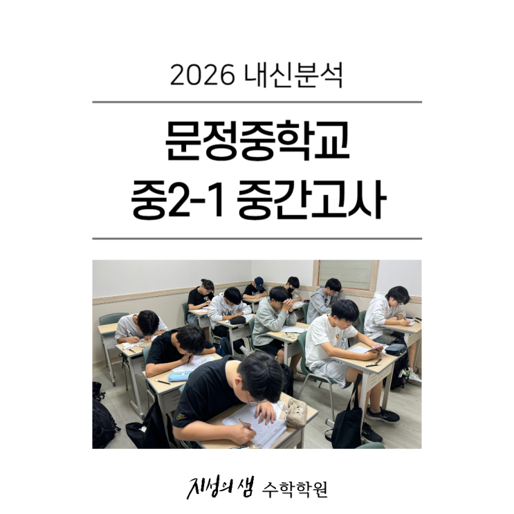안녕하세요. 지성의샘 수학학원 둔산점입니다. 문정중학교의 2026년 2학년 1학기 중간고사 분석자료입니다. 다음 시험을 준비하실 때 많은 도움이 되시기 바랍니다. 출제 요약 출제 범위 : 1. 유리수와 순환소수 ~ 3. 일차부등식 문제 유형 : 객관식 25문제 전반적인 난이도 : 중상 1. 유리수와 순환소수 문제가 25문제 중 10문제로 가장 많았습니다. 기초 문제부터 실수를 유도하는 문제, 특이한 규칙을 찾는 문제까지 폭 넓은 문제들이 있었습니다. 2. 단항식, 다항식의 계산에서는 기초적인 계산 문제 6개와 문자를 포함해 난이도를 높인 문제 2개가 있었습니다. 기초적인 계산 문제에는 간단한 문제가 아닌 시간을 요구하는 문제가 포함되었....... <img src="https://blogthumb.pstatic.net/MjAyNjA0MjhfNDQg/MDAxNzc3MzU2OTUzOTQy.c14wsOpgt7CnB8iQfb7A0hD6sXeBcC0Ok9ZYzS6iDzsg.lCIWEedzyHyCCLL0MP6MiQcCPRjA4fvGtn2jAaKLrAcg.PNG/%B3%BB%BD%C5%BA%D0%BC%AE_%BA%ED%B7%CE%B1%D7_%C0%CC%B9%CC%C1%F6-007.png?type=s3" />