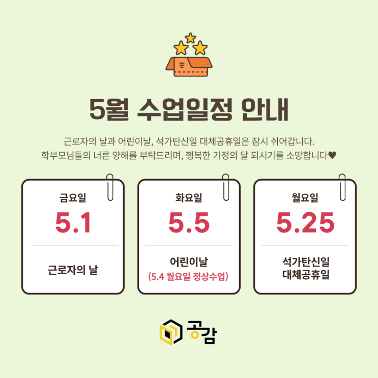 신곡동수학학원 공감수학에서 5월 수업 소식을 전해드려요 안녕하세요, 공감쌤입니다. 오늘은 5월 수업 일정을 안내해 드리려고 해요. 5월은 흔히 가정의 달이라고 불리는 만큼, 다양한 행사와 기념일이 있는데요. 5월 1일 근로자의 날과 5월 5일 어린이날, 5월 25일 석가탄신일 대체공휴일은 공감수학도 잠시 쉬어가려고 해요. 단, 5월 4일 월요일은 정상 수업이라는 점! 만약 개별적으로 시간표 조정이 필요하면 미리 학원으로 문의해 주세요 :) 하지만 5월에 아무리 행사가 많아도 학습적인 부분을 소홀히 할 수는 없잖아요. 특히 6월에는 테솜수학학력평가와 중학교 및 고등학교 기말고사가 있기 때문에 미리미리 준비할 필요가 있어요. 따라....... <img src="https://blogthumb.pstatic.net/MjAyNjA0MjdfODgg/MDAxNzc3Mjc4NDQ0OTEx.qa6My4OZYUMqMtGntcJt7hzucwLYDiqPCYLSIZM8m_Eg.cQLF3QI1i-HFO9YjuNhKZk7Gcn7DcY05r2FZ4Z5irPIg.PNG/%B0%F8%B0%A8%BC%F6%C7%D0_5%BF%F9%BC%F6%BE%F7_%BE%C8%B3%BB.png?type=s3" />
