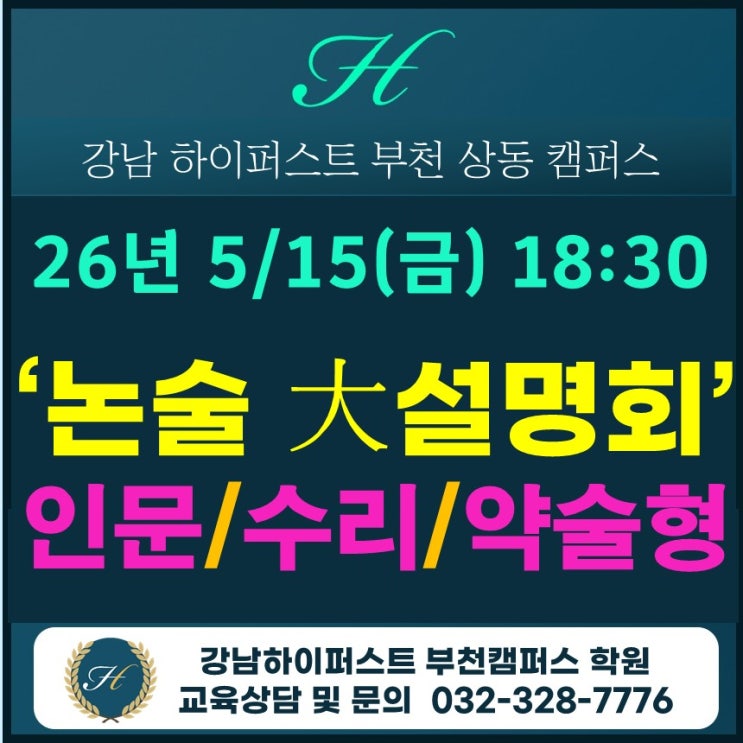 안녕하세요~~ 강남하이퍼스트 부천캠퍼스 원장 이정아입니다. 중간고사가 마무리되고 신록이 짙어지는 계절의 여왕이라는 시기입니다. 이 시기가 되면 많은 수험생과 학부모님들의 마음속에는 불안과 기대가 교차합니다. 내신 성적은 이미 어느 정도 윤곽이 잡혔고, 다가올 6월 모의평가는 두렵기만 합니다. "지금 이 성적으로 내가 원하는 대학에 갈 수 있을까?"라는 질문에 명쾌한 답을 내리기 어려운 시점이죠. 그래서 준비했습니다. 오는 5월 15일, '논술에 관한 모든 것'이라는 주제로 특별 설명회를 개최합니다. 논술로 인서울대학을 쉽게 갈 수 있는 A부터 Z까지 모든 것을 알려드리겠습니다. 논술설명회 일시 : 2025....... <img src="https://blogthumb.pstatic.net/MjAyNjA0MjNfODYg/MDAxNzc2OTM4ODExMDMx.W-MyKy-bwgDI5r-Mkj70ZTjY-W78aS48VHCV3W8s6ugg.6HjeMW6P-Go_kTcltNnnBklU2XAhC5asJYB51E4u3agg.JPEG/%B3%ED%BC%FA%BC%B3%B8%ED%C8%B80515.jpg?type=s3" />