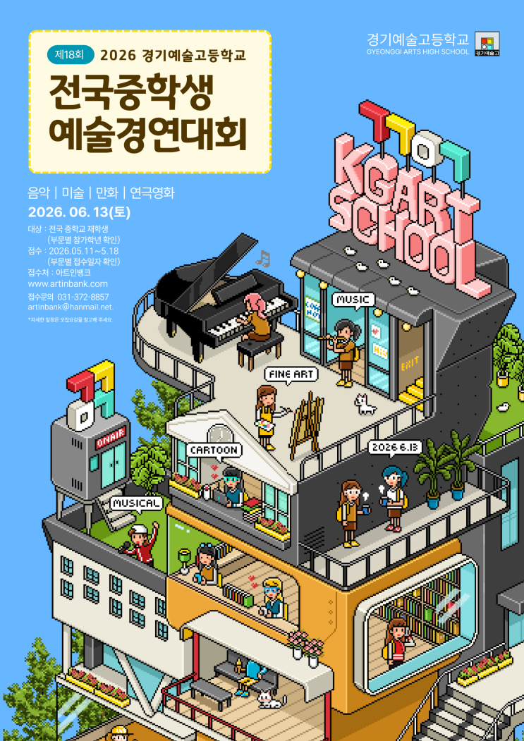 안녕하세요~ 후곡 애니 창아입니다. 이번에도 저를 많이 기다리셨죠? 오늘도 새로운 소식을 들고 찾아왔습니다. 이제 슬슬 저를 기다리는 분들이 많아지는 것 같지만 들뜨지 않고 스근~하게 안내 드리겠습니다~ 바로 '제18회 2026 경기예술고등학교 전국 중학생 예술경연대회' 개최 소식입니다! 특히 이번 대회는 코로나19 팬데믹 이후 무려 7년 만에 다시 열리는 대면 실기대회라는 점에서 그 의미가 매우 남다릅니다. 오랫동안 멈춰있던 오프라인 경연의 장이 다시 활짝 열리는 만큼, 더욱 뜨거운 열기와 감동이 가득한 현장이 될 것으로 기대됩니다. ️ 경기도 예술 교육의 요람, 경기예술고등학교는? 경기도 부천시에 위치한 공....... <img src="https://blogthumb.pstatic.net/MjAyNjA0MTVfMjA4/MDAxNzc2MjM3NzI4NDI1.gqZOXWyXRfIYECr-oYbzUn650HgsU-eKrghp5bLfa7kg.kVbAQSP0YF_hRmxA7eeDwZPuZFPk4m20JJBhw4ZvAv8g.PNG/kgart.hs.png?type=s3" />