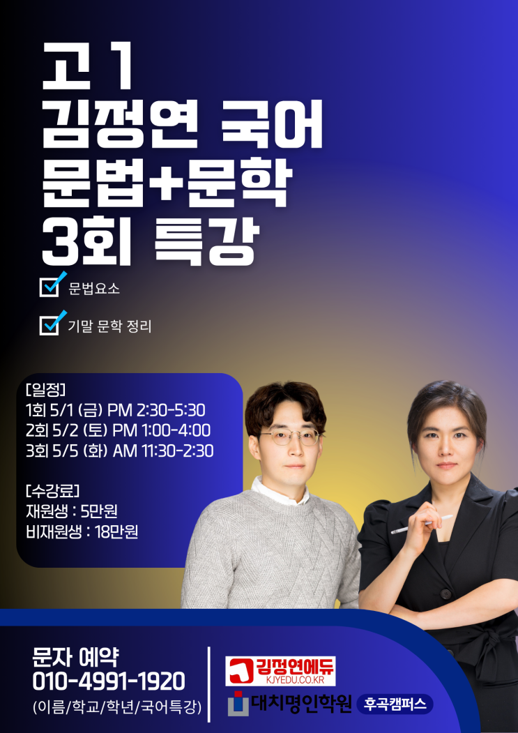 잔인하게 느껴질 만큼 바쁜 1학기 중간고사가 마무리되어갑니다. 시험 결과에 대한 안도 혹은 아쉬움이 채 가시기도 전, 우리 앞에는 더 큰 산들이 기다리고 있습니다. 바로 기말고사와 6월 모의평가입니다 5월 연휴, 단 3일의 독한 몰입이 다가올 6월 모의평가와 기말고사의 자신감이 됩니다. 불안함이 확신으로 바뀌는 경험, 김정연 국어와 함께라면 가능합니다. [ 고 1 ] ① 내용: 기말 성적의 승부처: 문법 요소 & 문학 집중 공략 ② 일정: 1회 5/1 (금) PM 2:30-5:30 2회 5/2 (토) PM 1:00-4:00 3회 5/5 (화) AM 11:30-2:30 ③ 수강료: 재원생 : 5만원 비재원생 : 18만원 "기회는 모두에게 주어지지만, 그 기회를 성적으로 바꾸는....... <img src="https://blogthumb.pstatic.net/MjAyNjA0MjBfMTQ3/MDAxNzc2Njc0MDEzMzk4.wnKPkt1RRccAwX1gB52AGs-MEc4HlAq7bpSTC_ULeoEg.XSxAKYJWO-sJaWhBVpFKzl1WAsma0eGnRv94wQYsK3Yg.PNG/27%B3%E2_6%B8%F0_%B4%EB%BA%F1_3%C8%B8_%C6%AF%B0%AD_-_%BF%DC%BA%CE%BF%EB.png?type=s3" />