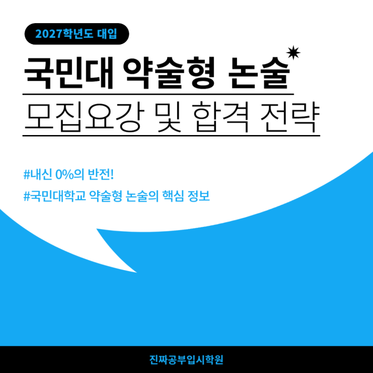 인서울 상위권 대학 진학을 꿈꾸는 수험생 여러분, 주목해 주세요! 2027학년도 대입 수시 전형 중 가장 파격적인 기회 중 하나인 국민대학교 약술형 논술의 핵심 정보와 합격 비책을 공개합니다. 국민대학교 약술형 논술은 내신 성적에 대한 부담 없이 오직 실력으로만 승부할 수 있는 전형으로, 중위권 학생들에게는 '기적의 합격'을 가능하게 하는 최고의 선택지입니다. 포인트 1. 내신 미반영! 오직 '논술 100%' 선발 국민대 약술형 논술의 가장 큰 특징은 내신 성적을 전혀 반영하지 않는다는 것입니다. 모집 인원: 총 206명 (인문계열 63명, 자연계열 143명) 전형 방법: 학생부(내신) 반영 없이 논술 100% (1,000점....... <img src="https://blogthumb.pstatic.net/MjAyNjA0MjRfNSAg/MDAxNzc3MDE1NzU0NTU4.8iTwfol8J-bNPrBOH_XrD3khF2Z2iOgYaoLY6xcvR2Ig.-f-5qNJOQYwP45UtKnvcKFTE80oixqCmK2ddYfAsgxIg.PNG/%BA%ED%B7%CE%B1%D7_%B1%B9%B9%CE%B4%EB_%BE%E0%BC%FA_%B3%ED%BC%FA_%B8%F0%C1%FD%BF%E4%B0%AD_%BF%CF%BA%AE_%BA%D0%BC%AE-001.png?type=s3" />