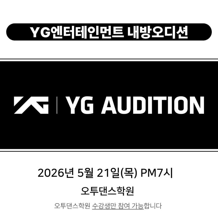 안녕하세요 파주 운정 댄스전문학원 오투댄스입니다 5월 내방 오디션 일정 안내합니다 YG엔터테인먼트 5월 21일 저녁 7시 모드하우스 5월 26일 저녁 7시 <img src="https://blogthumb.pstatic.net/MjAyNjA0MjRfNzgg/MDAxNzc2OTkyNTEwMjcz.jBvbVAeu_HQ5cf8o0TBQ8Mb4s_SmXjzETlIEKWhoQ0Ig.OLwsMskrugkMv71h4EmcF7c7_DnkoHqhdO_d3oE9GCcg.JPEG/%C1%A6%B8%F1%C0%BB_%C0%D4%B7%C2%C7%D8%C1%D6%BC%BC%BF%E4._%2811%29.jpg?type=s3" />