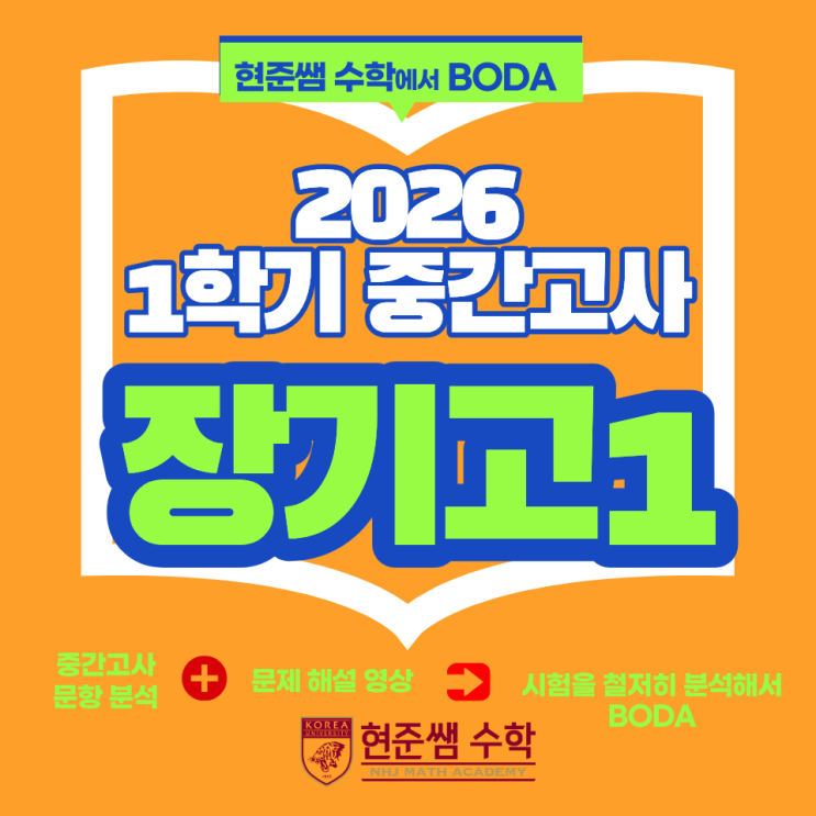 안녕하세요! 장기동 수학학원 현준쌤입니다. 오늘은 장기고 1학년 1학기 중간고사 시험을 분석합니다. 출제 문항 수 : 총 22문항 (객관식 20문항, 논술형 2문항) 시험 난이도 : 상 출제범위 : 다항식 ~ 이차함수 이번 중간고사도 역시 학교에서 나누어준 학습지에서 많은 문제들이 출제 되었습니다. 예전에 비해 많은 변형을 주기보다는 숫자들을 바꾸어 출제된것 같습니다. 하지만 각 문제들을 계산하는데 숫자 계산이 상당히 복잡해서 계산하는데 많은 시간이 걸렸던 시험입니다. 시간 부족으로 문제를 다 풀지 못한 학생들도 상당수 있던 것으로 보여집니다. 1번부터 14번까지의 문제들은 교과서 수준의 문제들로 출제되었습니다. 15번, 16번....... <img src="https://blogthumb.pstatic.net/MjAyNjA0MjVfMjAx/MDAxNzc3MTAxNTUwNzc3.EOpArprOSsMiy89PqWb6b5YmuGgekxwEcsKK_mrQ46Mg.UwcnGZgQePL1PtM24vNX3qWQHMhQcaVtwLBC6XEPfGgg.PNG/%C0%E5%B1%E2%B0%ED.png?type=s3" />