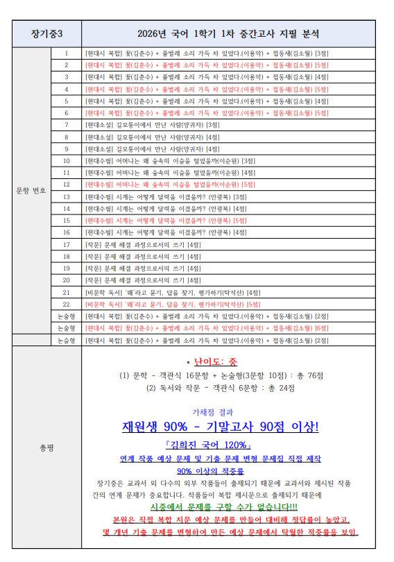 * 난이도: 중 (1) 문학 - 객관식 16문항 + 논술형(3문항 10점) : 총 76점 (2) 독서와 작문 – 객관식 6문항 : 총 24점 가채점 결과 재원생 90% - 기말고사 90점 이상! 김희진 국어 120% 연계 작품 예상 문제 및 기출 문제 변형 문제집 직접 제작 90% 이상의 적중률 장기중은 교과서 외 다수의 외부 작품들이 출제되기 때문에 교과서와 제시된 작품 간의 연계 문제가 중요합니다. 작품들이 복합 제시문으로 출제되기 때문에 시중에서 문제를 구할 수가 없습니다!!! 본원은 직접 복합 지문 예상 문제를 만들어 대비해 정답률이 높았고, 몇 개년 기출 문제를 변형하여 만든 예상 문제에서 탁월한 적중률을 보임. <img src="https://blogthumb.pstatic.net/MjAyNjA0MjNfMTkz/MDAxNzc2OTQxMzMyOTEw.zhY0V0xIhDYG7KlZncZKwW9IMuyHZz6BeAReG105HMIg.i3diiKJom_5GRjFMHoIAMR6Dsmp09vVOUfxO7mj4o1cg.PNG/2026%B3%E2_1%C7%D0%B1%E2_%C1%DF%B0%A3%B0%ED%BB%E7_%B1%E2%C3%E2%BA%D0%BC%AE%28%C0%E5%B1%E2%C1%DF3%29.png?type=s3" />