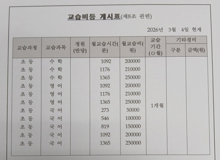 성신에듀학원 교습비 안내- 초등부 수학 영어 국어 (26년3월~)