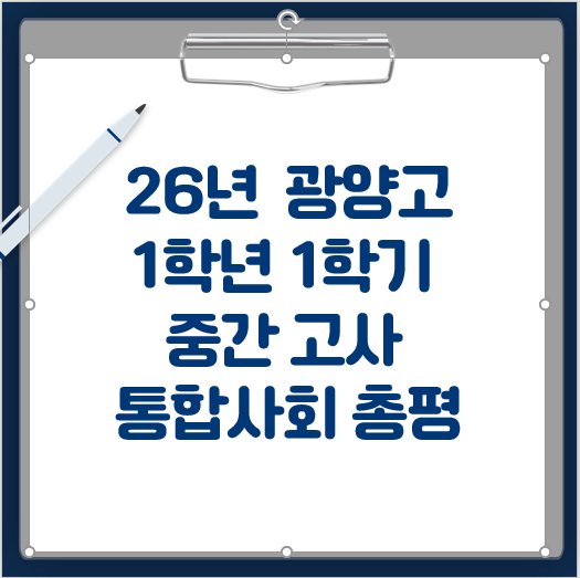 <광양고1> 2026학년도 1학기 중간고사 통합사회1 총평 안녕하세요. 국풍2000 사회강사 안연수입니다. 광양고등학교 1학년 통합사회1 중간고사 총평입니다. ⑴ 교재 : 지학사 2022 개정 통합사회 + 학교 프린트 ⑵ 중간고사 출제 범위 - 1단원 [통합적 관점] - 3단원 [자연환경과 인간] 01 - 4단원 [문화와 다양성] 01~02 - 5단원 [생활공간과 사회] 01 ⑶ 문제 비중 [선택형 25문항(94점) / 서답형 1문항(6점)] - 1단원 : 선택형 3문항 - 3단원 : 선택형 7문항 / 서답형 1문항 - 4단원 : 선택형 8문항 - 5단원 : 선택형 7문항 ⑷ 총평 이번 중간고사의 전체적인 난이도는 ‘중중’ 수준으로 평가됩니다. 지난 25학년도 1학기 중간고사와 비....... <img src="https://blogthumb.pstatic.net/MjAyNjA0MzBfMjEx/MDAxNzc3NTI3NzQzMzEw.-l3rQJ693BjDGC4SC4Gkrvi2AHceSfiynzl5HQVlTlkg.AmFPAHA3fVrlEsO3B01AbloF326MmvUD7lmqZgPmXtQg.PNG/image.png?type=s3" />