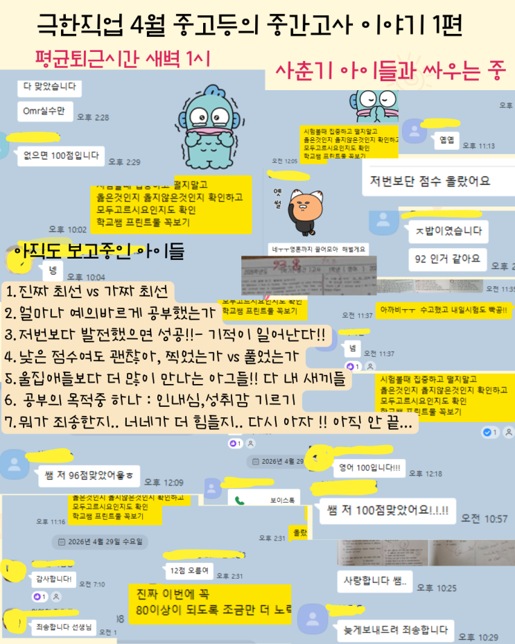드디어 오늘로 모든 학교의 중간 고사가 끝났다!! 새벽1시에 항상 마무리 하고 집으로 향해도 늘 감사했다. 아이들과 함께 하는 것만으로도 감사하다. 이 아이들이 시험을 치고 한두명씩 톡으로 또는 전화로 연락을 한다. 목소리가 다르다 1. 진짜 최선 vs 가짜 최선 2. 얼마나 예의바르게 공부했니? 너네도 알지 ?? 생각이 태도- 태도가 결과 3. 저번보다 발전했니? 기적은 일어난다 4. 낮은 점수여도 괜찮아. 그런데 찍었니 풀었니 ?? 5. 울집 애들은 누가 키우고 있지? 6. 공부의 목적 중 : 인내심 기르기, 성취감 기르기 7. 죄송하단 말 금지 !!! 시험때만 공부하지 말고 평소에도 계속 해야한단다. 시험 친 후 아이들 입에서 나온 말들 중 &....... <img src="https://blogthumb.pstatic.net/MjAyNjA0MzBfMjY0/MDAxNzc3NTQ3NTMzNzA4.AtDAqOBvQq-Skvgj7Uo5PZXDQqrPvXD6ufi7TzQBb68g.TTkwUxshO2CpcCJh91lX3_F0CWjcjLrsg69xfMlU3yEg.PNG/8888888888888.png?type=s3" />