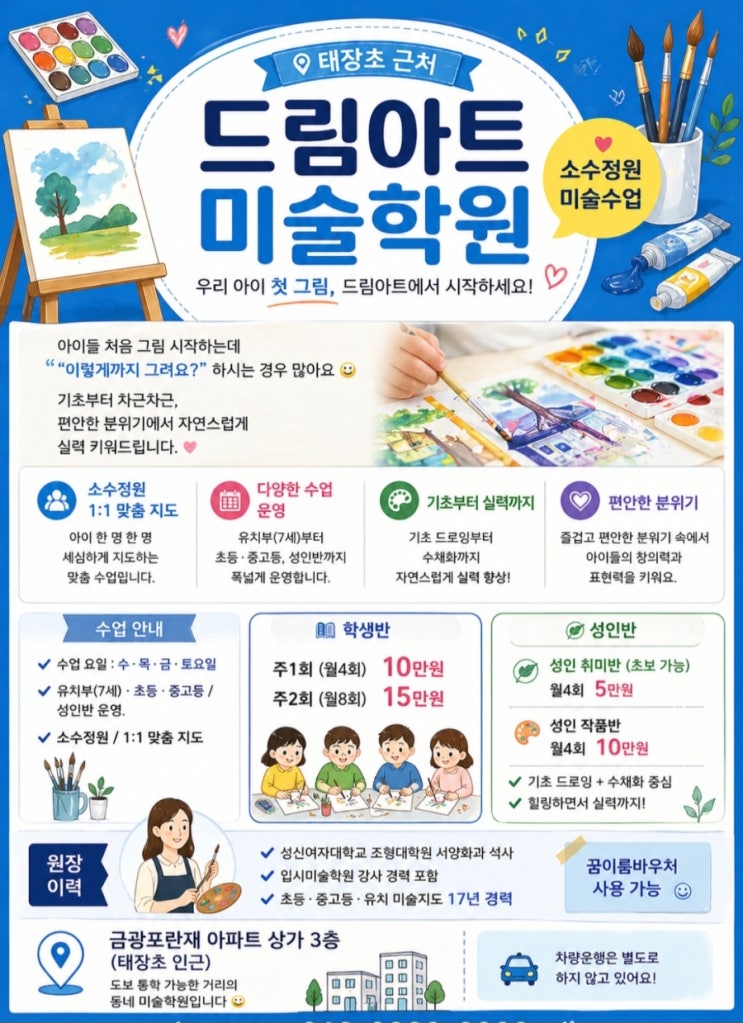 태장초 근처 드림아트미술학원입니다 소수정원으로 아이들 한 명 한 명 차분하게 지도하고 있어요 처음 그림 시작하는 아이들도 기초부터 자연스럽게 실력이 늘어요. ✔ 유치부(7세) · 초등 · 중고등 / 성인반 운영 ✔ 소수정원 / 1:1 맞춤 지도 / 편안한 분위기 학생반 ✔ 주1회반(월4회) 10만원 ✔ 주2회반(월8회) 15만원 성인 취미반 (초보 가능) ✔ 주1회반(월4회) 5만원 성인 작품반 ✔ 주1회반(월4회) 10만원 금광포란재 아파트 상가 3층 (태장초 인근) 편하게 문의 주세요 원장 010-3257-7891 ✔ 아이들 작품은 프로필에서 확인 가능해요 감사합니다 <img src="https://blogthumb.pstatic.net/MjAyNjA0MjVfMjAw/MDAxNzc3MTExMTgyNDE1.VxuYoPg-qv0TqA0UwHE-OOFawQMvj71XOSNMma1DZAUg.c8ocz-d2Kmr4ESnhaYDRzgqqIm7iyRCHsVouvmC6yygg.JPEG/900%A3%DF1777110402704.jpg?type=s3" />