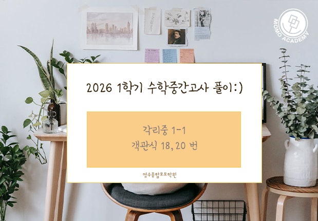 모모는 항상 여러분을 응원합니다:) 2026학년도 각리중학교 1학년 1학기 수학중간고사 [객관식18,20번]풀이입니다:) 모모수학T 신재윤 선생님의 풀이영상:) 공부의 멘토! 인생의 멘토! 모모학원 입니다:) TEL)043-215-5517 상담은 5층으로 오세요:) https://www.instagram.com/momolove1101/ <img src="https://blogthumb.pstatic.net/MjAyNjA0MzBfMjI0/MDAxNzc3NTU4OTYwNjM5.KnyilMw8Gk-xWwKJcCphVIKWBWZM9qJVUQCuPac-VI0g.sqtK5IwosExu21QsplOoMRa2g9I3C3_4TqRS7BvBaSwg.JPEG/%B0%A2%B8%AE1.jpg?type=s3" />