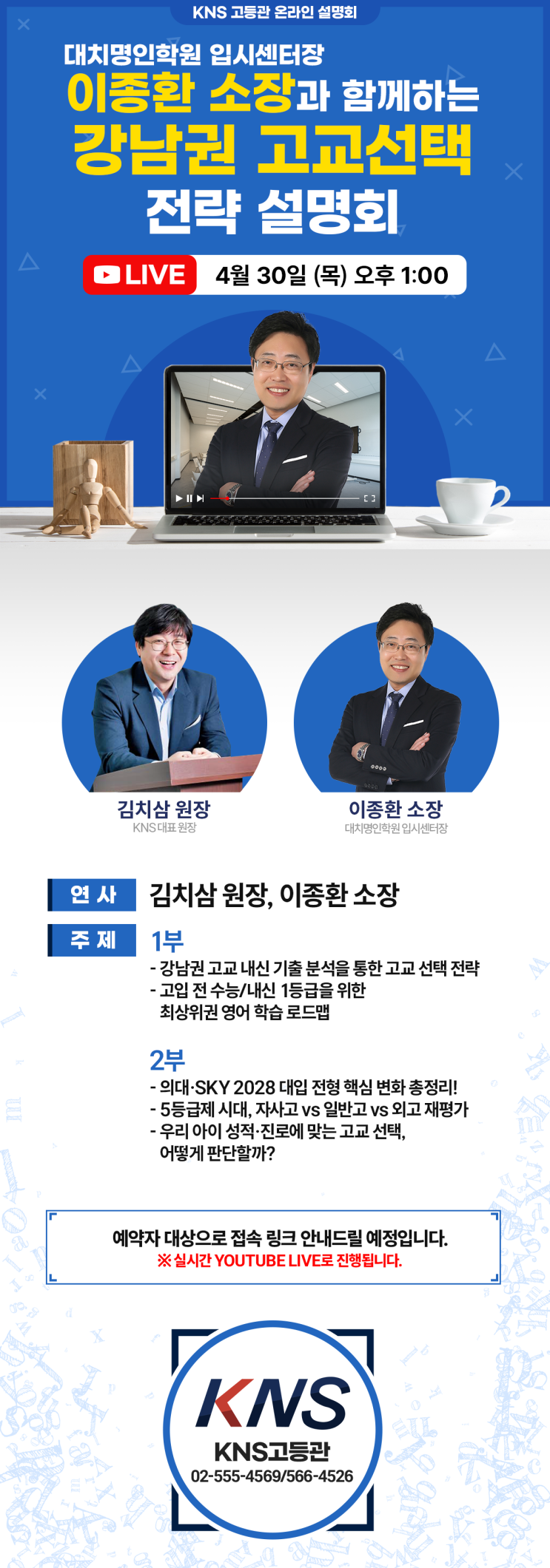 [KNS] 대치 명인 이종환 소장과 함께하는 강남권 고교선택 설명회 2028 의대·SKY 대입 대 해부! 고교 선택의 답이 바뀌었습니다! 오는 4월 말 발표되는 전국 대학 2028학년도 전형 계획, 대치동 일타 입시 전문가 대치 명인 이종환 소장의 가장 빠르고 가장 독보적인 해설! ==== ※ 대치 명인 이종환 소장과 함께하는 강남권 고교선택 설명회 ※ ▶ 일시: 4월 30일 (목) 오후 1:00 ◀ ★YOUTUBE LIVE★ ▶ 주요내용: [1부] 김치삼 원장 (KNS 대표 원장) - 강남권 고교 내신 기출 분석을 통한 고교 선택 전략 - 고입 전 수능/내신 1등급을 위한 최상위권 영어 학습 로드맵 [2부] 이종환 소장 (현 대치명인학원 입시센터장) - ....... <img src="https://blogthumb.pstatic.net/MjAyNjA0MjhfNTIg/MDAxNzc3MzQ5MTQwODIw.JL9fDLEscazN2vOHZVnpzi9Su5wQ2wFM1zGuQ2bZxJgg.-lUJnMVtZdVfQXlYlaSYFaNmrwtC6OXD3T-55RvMinYg.PNG/0430_%BC%B3%B8%ED%C8%B8.png?type=s3" />