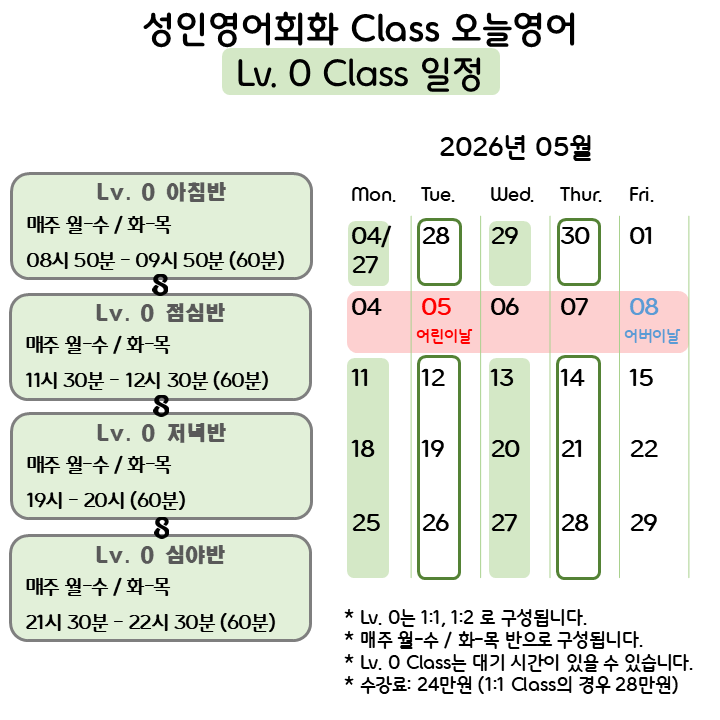 오늘영어의 05월 Class 일정 안내입니다! ☆ Lv. 0 ☆ Lv. 1 ☆ Lv. 1.5 ★ Lv. 2 사전미팅 안내 Class 및 상담 진행으로 통화를 받지 못하는 경우가 많습니다. 문자메세지 주시면 신속하게 답변 드리고 상담 일정 오늘도 파이팅입니다! <img src="https://blogthumb.pstatic.net/MjAyNjA0MjJfNzcg/MDAxNzc2ODQ4ODc2MDg4.6B0WDylUedjvfwn6VmXE1wpDC15dV-Tgyu6OlWv5vxkg.Yr-55fp4ge9fnQrBZOH4ojvvnzVERFNTMp2scTjFFfMg.PNG/Lv._0_(2026.05).png?type=s3" />