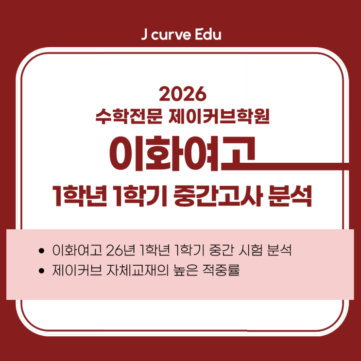 안녕하세요, 이화여고 수학내신대비 서대문구 제이커브학원입니다. 4월 28일(화), 이화여고 중간고사 수학 시험 날이었습니다. 작년보다 소폭 어려운 난이도 속에서도 명실상부 이화여고 전문 수학학원답게! 제이커브 박소윤T 수강생 중 당당하게 97점을 받아온 학생이 나왔습니다. 뿐만 아니라, 90점대 점수를 받은 학생과 1등급 컷라인에 걸려있는 학생들까지 역시! 이화여고는 제이커브라는 자부심이 느껴지는 날이었습니다. 어떤 학원보다 빠르게 제이커브학원에서 분석한 이화여고 1학년 수학 중간고사 내신시험 분석, 함께 살펴보겠습니다. 이화여고 26년 1학년 1학기 수학중간고사 기본개요 이번 이화여고 1학년 1학기 중간고사 수학 시험....... <img src="https://blogthumb.pstatic.net/MjAyNjA0MjhfMTk2/MDAxNzc3Mzg2NDE1MDA3.x6yfZMWoeHukVQO4NoxDkX4_Ng_sr6CZF0dey85qFX0g.2kwJyuNU9q5ODyxD7HbBE0X8OPEl1U1vsM8dA3d8-0Eg.PNG/1.png?type=s3" />
