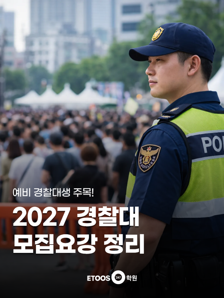 안녕하세요! 이투스247학원 공식 블로그입니다. 2027학년도 경찰대학교 모집요강이 드디어 공개됐는데요! 지원 접수 일정을 포함한 1, 2차 시험 그리고 제출 서류는 어떤 것이 있는지 지금 바로 확인하시죠! 2027학년도 경찰대 모집인원 및 지원 자격! 2027학년도 경찰대 입학 정원은 남녀 통합, 학과 구분 없이 단일 모집 단위로 운영되는데요! 일반전형은 44명, 특별전형은 농어촌 3명, 한마음 무궁화 3명으로 운영, 총 50명을 모집합니다. 또한 일반 및 특별전형에서 미충원이 발생할 경우 다른 전형 예비순위자 중 성적 우수자를 충원하는 점 참고해 주세요! 2027학년도 경찰대 지원 자격은 입학년도 기준 17세 이상 42세 미만인 사람, 그리....... <img src="https://blogthumb.pstatic.net/MjAyNjA0MjNfMTY3/MDAxNzc2OTI0OTc0NDMy.6prEZt-ATUrc2fXu1ZHUnfh5xl3-p3sTBizKlzLiXGsg.oVsXKyEJRoQWLF1u7aytwpj71Bj039aJeDeCfFu2P1wg.PNG/1.png?type=s3" />