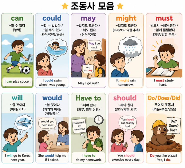 안녕하세요? 에듀퀸영어쌤입니다. 조동사 10가지와 예문 그리고 각 의도까지 정리해보았습니다. 중학 기초 영어를 다지는 중인 초등 4,5,6학년 학생들 또는 중학교 내신 시험을 준비하는 학생들이 빈출 조동사가 헷갈린다면 각 잡고 아래의 표를 암기해보는 것이 좋을 것 같습니다. can – ~할 수 있다 /~해도 된다 could – ~할 수 있었다 / ~일 수도 있다(과거/추측/공손) may – ~일지도 모른다 / ~해도 된다 (허가/추측) might – ~일지도 모른다 (may보다 약한 추측) must – 반드시 ~해야 한다 / ~임에 틀림없다 (의무/강한 추측) will – ~할 것이다 (미래/의지) would – ~할 것이다 (과거의 미래/가정/공손) Have to - ~해야한다.(의무....... <img src="https://blogthumb.pstatic.net/MjAyNjA0MjlfMTg4/MDAxNzc3MzkzNDIxMzA2.0Ege9hLVf9cWBcqcDmhTNE1zTLXyNvqZ0DhdSsbNqW4g.LU_Deo-ugeKTs0eY__SIxT27T13N1OmIIcviYZUxpPwg.PNG/900_file_00000000a3bc7209ac2d0c4ff1ad134c.png?type=s3" />