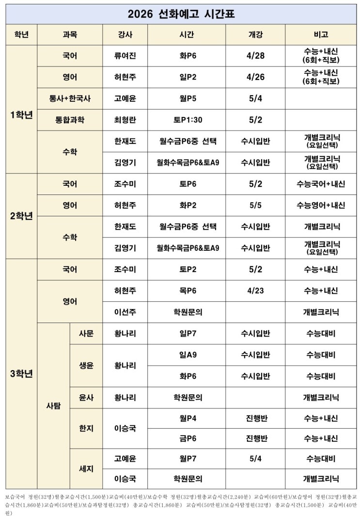 선화예고1 ▶국어 - 류여진T - 4/28 화P6 ▶영어 - 허현주T - 4/26 일P2 ▶통합사회+한국사 - 고예윤T - 5/4 월P5 ▶통합과학 - 최형란T - 5/2 토P1:30 ▶수학 - 한재도T - 김영기T 선화예고2 ▶국어 - 조수미T ▶영어 - 허현주T ▶수학 - 한재도T - 김영기T 선화예고3 ▶국어 - 조수미T ▶영어 - 허현주T ▶사문 - 황나리T 일P7 ▶생윤 - 황나리T 화P6 ▶한국지리 - 이승국T 월P4 ▶세계지리 - 고예윤T 월P7 2026 선화예고 고1/고2/고3 수업시간표 다솔학원 상담전화 02 501 0306 <img src="https://blogthumb.pstatic.net/MjAyNjA0MjNfMTI1/MDAxNzc2OTM4MTg1Njc1.XwzGSv-KLT2lLUB_nOHRk_d4E57t9DvywnK7yf5za0Ag.zD1YRvrgbEQoGy75l0NEAlAlic5nFEovkqfd_nWOiqwg.JPEG/%B4%D9%BC%D6%BC%B1%C8%AD%BF%B9%B0%ED%BD%C3%B0%A3%C7%A5_%282%29.jpg?type=s3" />