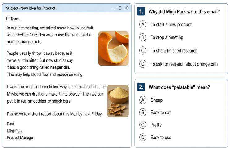 안녕하세요? '수원토플학원'으로 좋은 추천을 받고 있는 서울 강남 『대치동 족집게어학원』입니다! 이번 글에서는 2026년에 개정된 뉴토플(신토플) 리딩(R/C) 신유형 - 이메일 읽고 답하기(Email Reading)를 응용하여 아주 쉬운 왕기초문제를 만들어봤습니다. 영어 왕초급이지만 토플 리딩 신유형 문제를 한번 풀어보고 싶은 학생들을 위해 수원토플학원에서 특별히 왕기초(왕초급) 영어로 구성하고 간단한 설명도 넣어서 아주 쉬운 토플 리딩 문제를 만들어보았습니다! 관심있는 분들의 많은 이용 바랍니다! Read the article and answer the questions. Subject: New Idea for Product Hi Team, In our last meeting, we talked abo....... <img src="https://blogthumb.pstatic.net/MjAyNjA0MjNfMjAx/MDAxNzc2OTQyOTY4MDk2.dWtcb60esHq0H1_WgJSNKRskNw7Y6WhnzVor5p7YP_Ag.-r55xBsbx0F-eYquem-jFl7_32DWtO0NETXwnp3c2p0g.PNG/%C5%E4%C7%C3%C7%FC%B9%AE%C1%A6_%C0%CC%B9%CC%C1%F66.png?type=s3" />