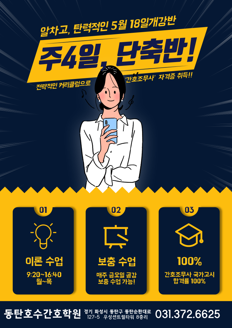 안녕하세요 호수지기입니다!! 이번에 5월반 단축과정 커리큘럼은 어떻게 하면 짧고 굵지만, 약간의 여유도 드릴 수 있을까... 고민해봤는데요 저희 고민끝에 답은 주4일 수업이었습니다. 먼저 제일 궁금하실 수업 시간부터 안내드립니다. [주 4일반] 9개월 단축과정 개강일 26년 05월 18일 이론수업 월-목 09:20-16:40 현장실습 월-금 09:00-17:00 간호조무사 자격취득과정은 어찌보면 시간싸움 이라고도 할 수 있는데요, 이론수업 740시간, 현장실습 780시간! 총 1520시간을 반드시 이수해야 국가고시 응시 자격이 주워지기 때문입니다. 이 긴시간을 9개월반 안에 담아야 하기에 단축과정을 선택한 훈련생분들은 타이트한 일정을 소화하신답니다....... <img src="https://blogthumb.pstatic.net/MjAyNjA0MTZfOTAg/MDAxNzc2MzE0NjIzMDU0.WRyucyRnhDFstTPnHx-tEe8eyRuhKc3W_KugTjtzzuwg.AiR-JFBT-aKIxfZaU-HjWrocnkF2bHj2YvcYH_GfMF4g.PNG/KakaoTalk_20260416_133712387.png?type=s3" />