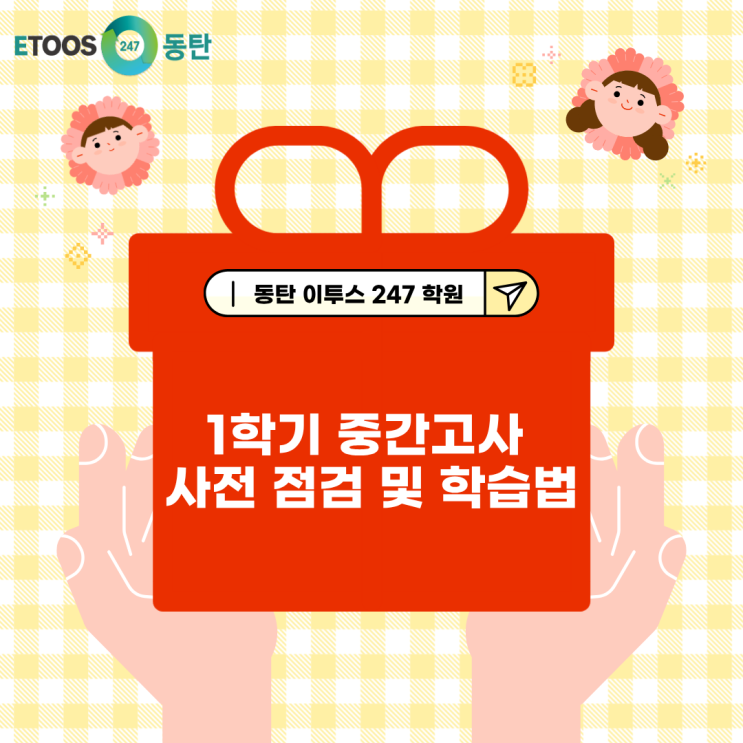 안녕하세요 동탄 이투스 247 학원입니다! 이제 중간고사 시즌이 다가왔습니다. 오늘은 1학기 중간고사 사전 점검 및 학습법에 대하여 알아보려고 합니다! 재학생 여러분들은 한 번씩 읽어보시면 도움이 많이 될 것 같습니다 ㅎㅎ 바로 시작해보겠습니다! 본 게시글은 아래 링크를 참고하여 작성되었습니다. https://edu.chosun.com/site/data/html_dir/2026/04/16/2026041680022.html 고교 내신은 대입에서 합격을 좌우하는 중요한 요소입니다. 그러므로 사소한 학교 프린트 내용이라도 꼼꼼히 점검하는 등 철저한 보완과 반복 학습이 필요합니다. 과목별 시험 범위의 정확성, 교과서의 중요 표시, 수행평가 포함 여부 등 반드시 챙겨야 할 요소....... <img src="https://blogthumb.pstatic.net/MjAyNjA0MjBfMTgz/MDAxNzc2NjcyOTExMjYy.aI7Ifolyb8UvQzgouSg-tjaLGG3bPABqE8zlqxkJ4Qwg.Q3rPo4_w1rwjW4QBLzsDZ-I6Moj0roW8TTYqiO4pYxwg.PNG/%C1%A6%B8%F1%C0%BB_%C0%D4%B7%C2%C7%D8%C1%D6%BC%BC%BF%E4._%2860%29.png?type=s3" />