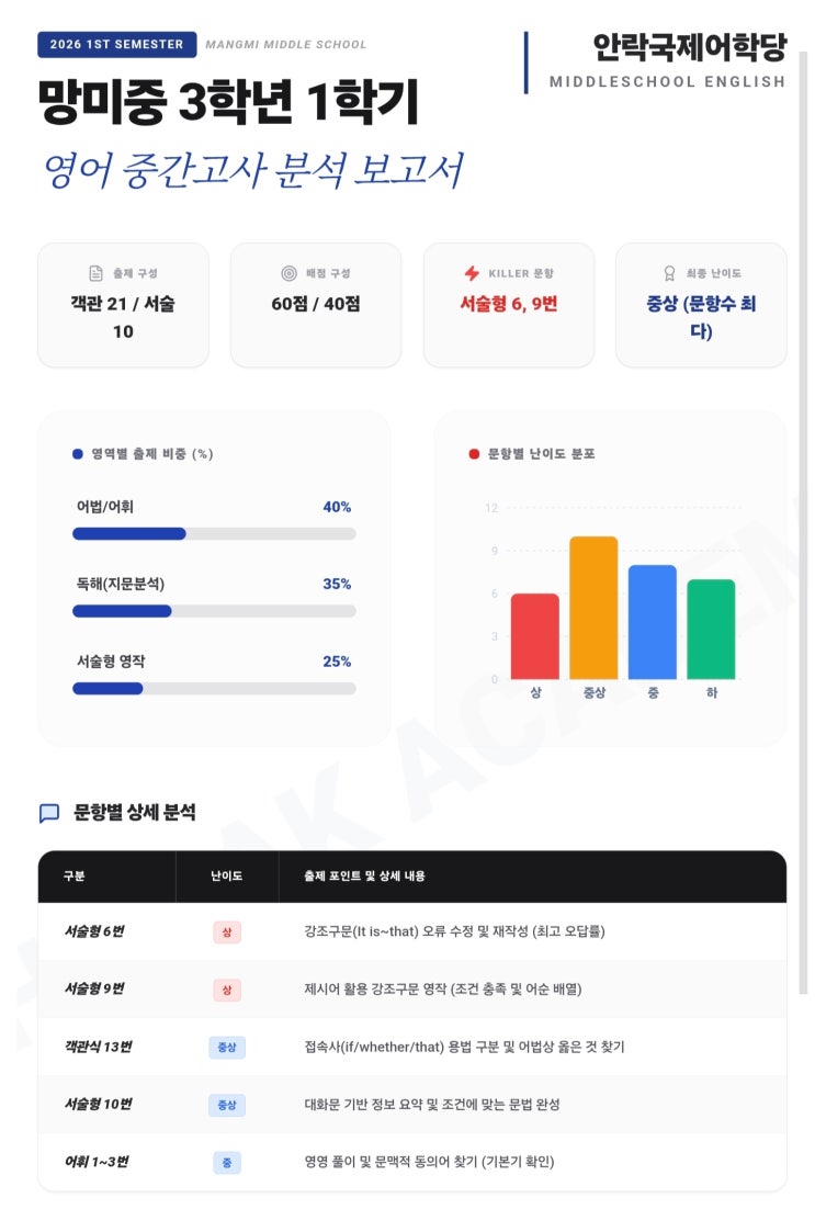 안녕하세요, 학부모님과 학생 여러분. 최근 치러진 망미중학교 3학년 1학기 중간고사에 대한 심층 분석 결과와 이를 바탕으로 한 향후 학습 방향을 안내 드립니다. 이번 분석은 학생들의 현재 위치를 점검하고, 다가오는 기말고사 대비를 더욱 알차게 준비하기 위해 작성 되었습니다. ▶핵심 변별력 포인트 1)방대한 문항수와 시간 압박 (선택형 21+서술형 10 문항) =>정확도와 속도 2)어법 수정형 서술 =>틀린 부분을 바르게 고치기 3)철저한 본문 숙지 =>지문의 세부 내용을 요약 및 영어로 답하기 ▶고득점 GUIDE 1)시간 관리 ‘1문항 1분컷’ =>선택형 문제는 30초 내외, 복잡한 서술형은 2-3분 2)어법 정교....... <img src="https://blogthumb.pstatic.net/MjAyNjA0MjhfMTI4/MDAxNzc3MzU0NzQ3MzQw.UwKUpnmAF6_RHqKDLhtkPDgUstMKWZXFaMcX1PduS0Ag.GCEtC0lct8_1ShygmNnheO9BQycmkHxq4TBumpA2Wi8g.JPEG/%B8%C1%B9%CC%C1%DF3.jpg?type=s3" />
