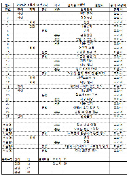 인지중 영어학원 ㅣ 인지중 2학년, 2026년 1학기 중간고사 영어 시험 분석, 서술형 적중
