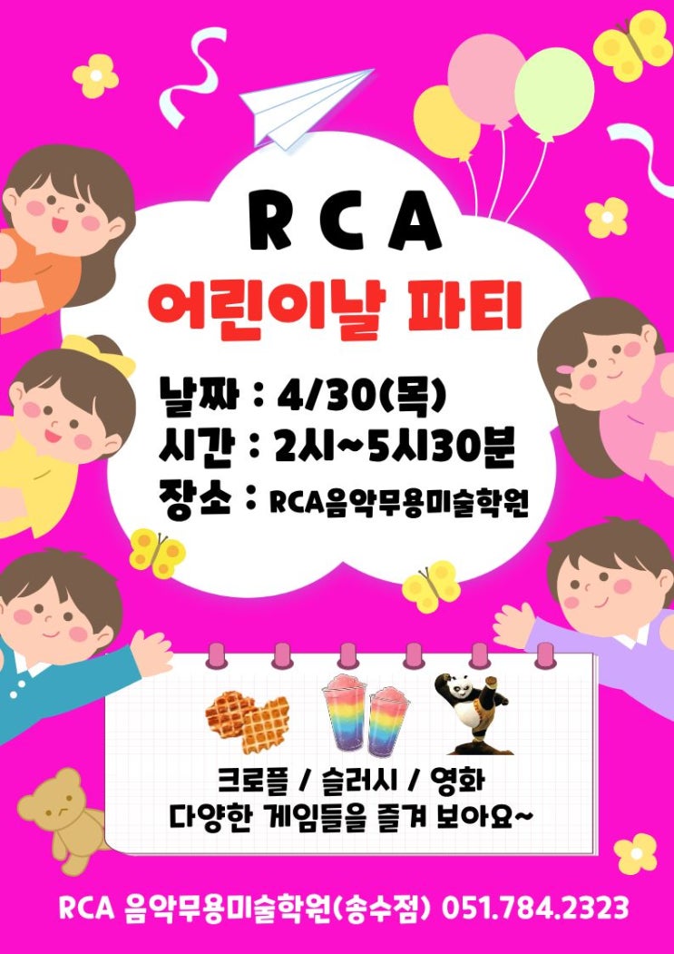 rca 어린이날 파티 ♥ 송수초등학교 - 예체능종합학원 먹거리 / 즐길거리 rca 친구들이 좋아할만한것들로 준비되어있어요 ^^ 즐겨보아요 ♥ 문의 051.784.2323 (송수점) <img src="https://blogthumb.pstatic.net/MjAyNjA0MjlfNjgg/MDAxNzc3NDQzNDk4NTAz.VIBrU7Gf8etwPXLVJoDoDPE5XU9v1k7l4oRO7reNqccg.Qshr0SB5acN3Y7TYD_Cesue-rSRfbndakjvYtAQ17wsg.JPEG/%C1%A6%B8%F1%C0%BB_%C0%D4%B7%C2%C7%D8%C1%D6%BC%BC%BF%E4._%283%29.jpg?type=s3" />