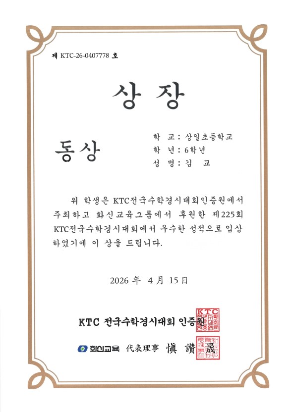 ## 이 게시물에서는 초등부 상장만 게시합니다 ## 안녕하세요 칼마수학입니다. 날씨가 갑자기 더워졌네요. 올해는 작년보다 더 힘들 것 같은 예감이 듭니다. 4월이 되니 우리 초등부 친구들이 학교에도 적응을 하고 단원평가도 1단원, 2단원 차례대로 시험을 보고 있습니다. 배운대로 실수없이 잘 보면 좋겠네요. 단원평가가 뭐 별거냐? 하시는 분들도 계시겠지만, 작은 경험치가 쌓여 자신감이 생기고 조금 더 잘해보고 싶은 마음이 동기부여가 되어 그 아이의 모습이 되는 것이라 생각합니다. 우리 아이들이 더 잘 할 수 있도록 많이 도와가도록 하겠습니다. 이번 KTC 전국경시대회에서도 좋은 결과를 보여준 학생들이 자랑스럽고, 상을 못 탄....... <img src="https://blogthumb.pstatic.net/MjAyNjA0MTdfMjA3/MDAxNzc2NDI3NzI1NjY0.sds1QMmcD-VR5x2ywNCq0L4pF9TweFi4fu9L_-7BTGYg.nes4R1j04cj0bctJt_IJ4ERkJe47bZzhx3_j4G7PrnEg.JPEG/%C8%AD%B8%E9_%C4%B8%C3%B3_2026-04-16_205354.jpg?type=s3" />