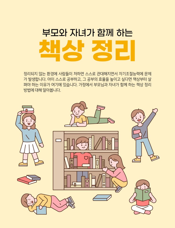정리되지 않는 환경에 사람들이 처하면 스스로 관대해지면서 자기조절능력에 문제가 발생합니다. 아이 스스로 공부하고, 그 공부의 효율을 높이고 싶다면 책상부터 살펴야 하는 이유가 여기에 있습니다. 가정에서 부모님과 자녀가 함께 하는 책상 정리 방법에 대해 알아봅니다. 책상 정리 1단계 : 분류하기 책상 정리의 시작은 자신에게 현재 필요한 물건 선별하기부터 시작돼야 한다. 책상 위에 놓여 있는 물건을 모두 꺼내 한곳으로 모은 후 공부방 물건과 공부방 물건이 아닌 것, 버려야 할 것을 먼저 분류해보자. 이때 아이에게 “사용하고 있는 물건은 책상 오른쪽에, 사용하지 않는 물건은 책상 왼쪽으로 놔 볼래!”라고 구체적으로 지령을....... <img src="https://blogthumb.pstatic.net/MjAyNjA0MzBfMTAz/MDAxNzc3NTMyNjIwNzEy.yKZgmNlri_GHVYRDN5Wv-8y_jtqSxIQlD3kIIXyp2v8g.XXIy-LEFOyYzT3McAf7qDMTsU5gSM2x8_6dfN7gAnQgg.JPEG/260504_%BF%F9%BF%E4_%C4%AB%B5%E5%B4%BA%BD%BA_-_%C3%CA%B5%EE.jpg?type=s3" />