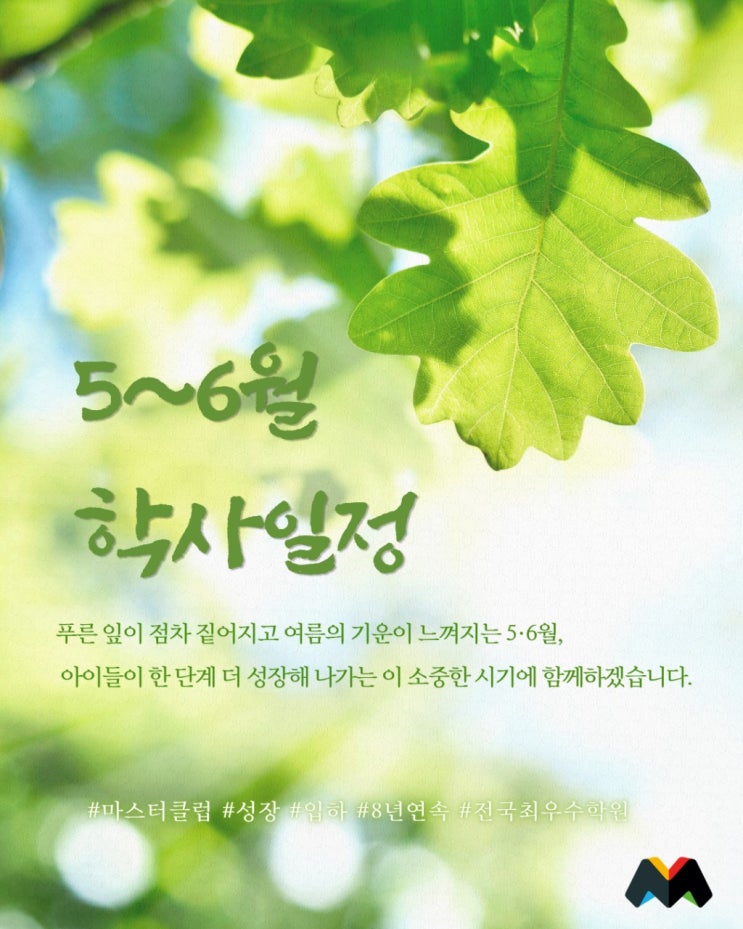 푸른 잎이 짙어지고 여름의 기운이 느껴지는 5·6월 아이들이 한 단계 더 성장해 나가는 이 소중한 시기에 마스터클럽이 함께하겠습니다. 5월 학사 일정 수업 기간: 5월 4일(월) ~ 6월 2일(화) 초등부: 주 20시간 중등부: 주 24시간 유치부: 주 16시간 중등부 수강일의 경우, 세부 일정을 확인해 주시기 바랍니다. ※ 5월 8일(금)은 원 내 Spring Festa 행사가 진행됩니다~! 6월 학사 일정 수업 기간: 6월 4일(목) ~ 7월 1일(수) 초등부: 주 20시간 중등부: 주 24시간 유치부: 주 16시간 중등부 수강일의 경우, 세부 일정을 확인해 주시기 바랍니다. 6월에는 경덕중·서현중 1~3학년 시험 대비 주말 수업이 예정되어 있습니다. 마스터클럽을 믿고 맡....... <img src="https://blogthumb.pstatic.net/MjAyNjA0MzBfMjQw/MDAxNzc3NTEyNTYxOTQw.c-6zLob86gxgw_suonQsNFG9L37Xs3IbyyrdnVsxCXwg.rliEsyvPkvJTmo3tcRZz98ZQT5tnroagDJRaUCZKWQ4g.JPEG/KakaoTalk_20260430_102415654_02.jpg?type=s3" />