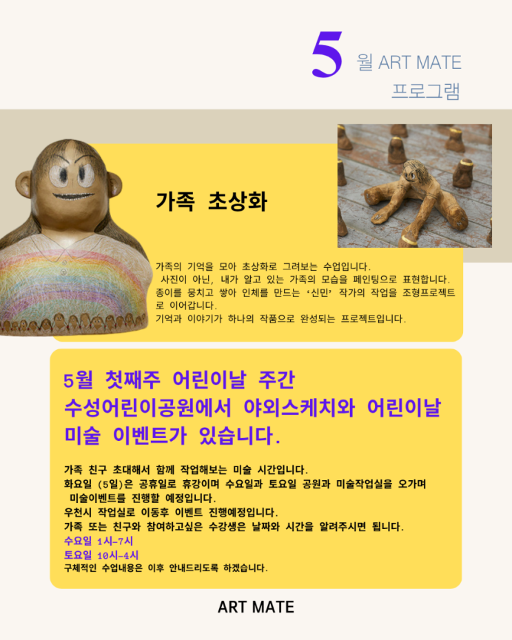5월 아트메이트 소식 안녕하세요, 아트메이트입니다. 5월은 ‘가족’을 주제로 한 작업과 아이들과 함께 밖으로 나가는 시간이 준비되어 있습니다. 정규반에서는 가족의 기억을 모아 초상화로 그려보고, 이후 종이를 뭉쳐 인체를 만드는 조형 작업으로 확장합니다. 사진이 아닌, 아이가 알고 있는 가족의 모습과 이야기를 하나의 작품으로 완성해보는 프로젝트입니다. 북앤아트는 4–6세 대상으로 진행되며, 그림책을 읽고 색과 질감을 탐색한 뒤 가베와 자연물을 활용해 자유롭게 표현하는 수업입니다. 원데이 수업은 월/금 오후, 토요일 오전에 열려 편하게 선택해 참여하실 수 있습니다. 그리고 5월 첫째 주, 어린이날을 맞아 수성어린이....... <img src="https://blogthumb.pstatic.net/MjAyNjA0MjFfMTMy/MDAxNzc2NzQyODUwMDIx.XjO_t8SplBObiiKJozIIrxlm0vhvj8RPUyetqemhnpsg.k8f3fNE397B_c5tENgAfMGxpe2VpcyFQd0i-D7PpLrog.PNG/900_1776740589926.png?type=s3" />