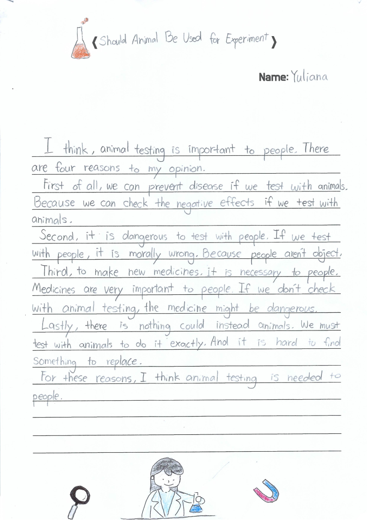 안녕하세요, 씨유 어학원입니다 :D 이번 주에는 아이들과 조금 색다른 주제로 영어 글쓰기를 해봤습니다 바로 ‘동물실험, 과연 찬성일까? 반대일까?’ 라는 주제였는데요! 이번 시간을 통해 아이들은 단순한 영어 글쓰기 활동을 넘어, 논리적으로 생각하고 자신의 의견을 표현하는 힘을 키울 수 있었습니다 ㅎㅎ Mind mapping 일단 본격적인 에세이를 쓰기 전, 마인드맵(mind map) 으로 생각을 정리해 보는 시간을 가졌습니다 ㅎㅎ 주제를 가운데에 적어두고, 떠오르는 생각들을 가지처럼 뻗어나가며 자유롭게 적어보게 했습니다! 과연 우리 아이들은 동물실험에 대해 어떤 입장을 선택했을까요? The Pro Side ♀️ 먼저 Yuliana 학....... <img src="https://blogthumb.pstatic.net/MjAyNjA0MTVfMTY3/MDAxNzc2MjM0ODM0NjYz.-uT3v9zsk-lm5C7Q9nX0De9Qzxgr3kQic6UINmFjcGUg.EhAADW5xaaNQKP_GUKMzvLq4gEjRZTlaZgmcChyYm9Ug.PNG/%B1%DB%BE%B2%B1%E2_2.png?type=s3" />