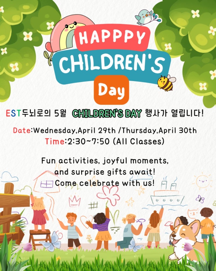 EST두뇌로의 Happy Children's Day가 Wed,April 1st 4/29(수) / Thu,April 2nd 4/30(목) 열립니다! 새학기부터 열심히 모은 스티커로 사고 싶은 물품과 맛있는 스낵도 먹는 즐거운 Children's Day가 되길 기대해봅니다:) <img src="https://blogthumb.pstatic.net/MjAyNjA0MjBfMjI5/MDAxNzc2NjY4OTc2NDY3.m7e2uNrAAET42lYDZJsGvKjCKq9P8cisXn_irRdc_9Eg.XoPdOd2nWXLi3UngcGyXqMOVDMdOayfihTw7qWTktDMg.JPEG/26%B3%E2_%BE%EE%B8%B0%C0%CC%B3%AF_%C7%E0%BB%E7_%C6%F7%BD%BA%C5%CD.jpg?type=s3" />