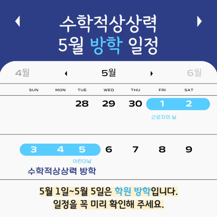 5월은 중간시험 이후 학습 리듬을 다잡고, 다음 단계를 준비하는 매우 중요한 시기입니다. #고운동수학학원 #강의하는아이들 아래 5월 일정을 확인해 주시기 바랍니다. {5월 수업일정} 수업 횟수: 주 2회(총 8회) / 주 3회(총 12회) 월/수/금 : 4월 29일~5월 27일 화/목 : 4월 28일~5월 26일 금/토 : 5월 1일~5월 23일 5월은 중간고사가 끝나고 자칫 학습 긴장도가 떨어지기 쉬운 시기입니다. 이 시기에 시행되는 **‘월간평가 및 누적테스트’**가 왜 아이들의 수학 실력을 결정짓는 결정적 한 수가 되는지, 그 중요성은 이후에 다시 업로드 해드리겠습니다! <img src="https://blogthumb.pstatic.net/MjAyNjA0MjRfMTE1/MDAxNzc3MDEyMzQ2ODMy.LWEuqvv1EfLunH5J0a6wPaLp4mPe5qLQE65uyIEFupgg.hh8lVNL0MrlfTyg8XaC5JjkMO_JTlskyFcodBAp_rcEg.PNG/1.png?type=s3" />