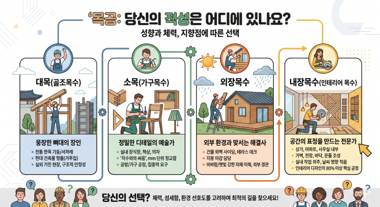 "전통적 숙련도와 미래형 기술이 만나는 지점, 내장목수의 진화" 건물의 뼈대를 세우는 것만큼이나 중요한 것이 바로 사람이 머무는 내부 공간을 완성하는 일이죠. 최근에는 단순히 나무를 다루는 기술자를 넘어, 디자인 감각과 디지털 도구 활용 능력을 갖춘 '스마트 목수'가 각광받고 있습니다. 평생직장의 개념이 사라진 시대, 당신의 손끝에 남을 확실한 기술을 찾고 계신가요? 목수를 평생 직업으로 고민 중인 분들을 위해 이 세계의 모든 것을 상세하게 설명해 봅니다. 1. 당신의 적성은 어디에 있나요? 목공은 그 범위가 매우 넓어 본인의 성향과 체력,지향점에 따라 첫 단추를 잘 끼워야 합니다. 대목(골조목수): 웅....... <img src="https://blogthumb.pstatic.net/MjAyNjA0MjFfMzUg/MDAxNzc2NzUxODcyNTE4.32cA6ITWL4x7FnqC3G-a65mm-VuBFgHOfGhVCYmUvDUg.aVGI2G6I8AZ15Yx62EmZ238R4A9Wy-n-P0m9O5DpaTAg.PNG/Gemini_Generated_Image_kqfh6mkqfh6mkqfh.png?type=s3" />