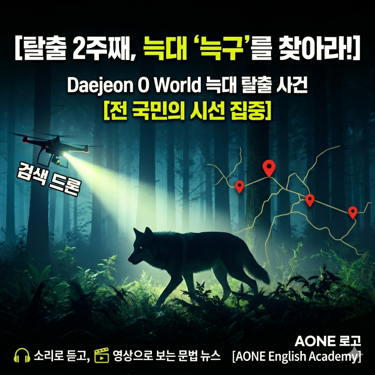 The search for Nukgu / a wolf that escaped from Daejeon O World / has entered its 2nd week / holding the nation's attention. 누구를 찾는 수색이 / 대전 오월드에서 탈출한 늑대 / 2주째에 접어들었다 / 전 국민의 주의를 붙들면서 Meanwhile / a real-time tracking website has popped up online / and the story has gained traction overseas / through viral memes / turning it into a global talking point. 한편 / 실시간 추적 웹사이트가 온라인에 갑자기 등장했고 / 이 이야기는 해외에서 주목을 얻었다 / 바이럴 밈을 통해 / 그것을 전 세계적인 화제거리로 만들면서 Right? / It really looks like a wolf / "Wher....... <img src="https://blogthumb.pstatic.net/MjAyNjA0MjFfNTEg/MDAxNzc2NzM1OTg0MjY0.9KJD3U4ChAe-C-brAjYJw2JJegTapUhUNHM-ynGxrpgg.QGbs96pPNcDsbYIVblvNAnS5dFv0sRHgyYiwKtZ96NYg.PNG/Gemini_Generated_Image_743sch743sch743s.png?type=s3" />