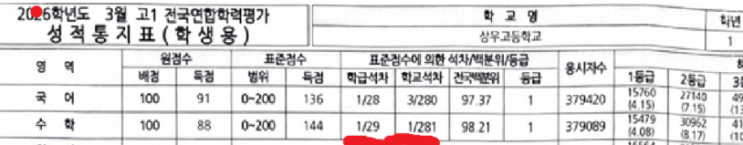 얼마 전에 치룬 3월 모의고사에서 저희 영석고 1학년 학생이 2등급을 맞았습니다. 타 과목보다 수학을 걱정했던 학생인데, 다행히 나쁘지 않은 결과가 나왔습니다. 반에서는 1등이라고 하네요 ^^ ----------------------------------- 영석고 1학년 모의고사 결과를 통해 좀 더 분석하여 말씀드리자면, [1학년 전교생 270명]중 (수학) 2등급 이상(전국11%)의 학생들은 20~30명 정도로 추정되며 1등급(전국4%)이 나온 학생은 5명 정도라고 들었습니다. 즉, 이번 영석고 1학년 학생의 수학 수준은 전국 단위로 보면 1등급(전국4%) 학생 수는 조금 밀리지만, 2등급 이상(전국11%)의 학생 수는 충족하는 분포입니다. 참고로 xx고 에서는 수학 4등급인....... <img src="https://blogthumb.pstatic.net/MjAyNjA0MTRfMjUw/MDAxNzc2MTU5NzQzODQx.vXdeYD0Ch6e6mECbZs_0hX9ccNENXNF1vndommiG3mMg.YQBWr0N8J4D49F63GwUFzzKgurtvPl8Db1f6DAxHZHkg.PNG/image.png?type=s3" />