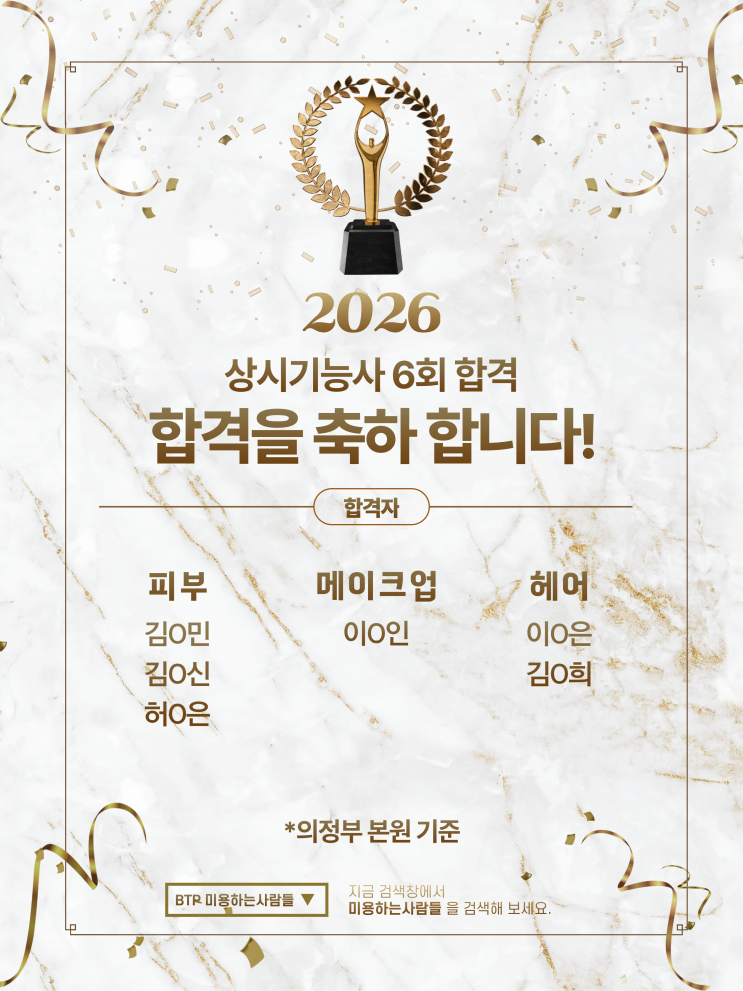 합격자 발표 안녕하세요! 이번 시간에는 미용 국가자격증 상시 기능사 시험! 6회차 합격자 발표 소식을 전해드려 보려고 합니다. 과연 BTP 미용하는사람들 뷰티아카데미 의정부 본원에서 6회 합격은 어떤 과목에서 이루어졌을지 지금 바로 확인해 보시죠. 최근 꾸준하게 많은 자격증 합격생을 배출 중인 의정부 미용학원! 이번 6회차에서도 피부를 비롯하여 메이크업, 헤어 과정에서 자격증 합격생을 배출 했습니다. 여러 지점 합산 수치가 아닌, 의정부 본원 기준으로 매번 합격자 발표 소식을 전해 드리고 있는데 이번 시험에서도 목표로한 자격증 취득에 성공한 수강생 분들 모두 축하의 마음을 전하고 싶어요! BTP 미용하는사람들 의정부 본....... <img src="https://blogthumb.pstatic.net/MjAyNjA0MjFfMTU4/MDAxNzc2NzYyMTQ5ODky.SdtTq4z5wiEkQHhVIBGTmDo_9Id_HkP8Bhw4khg421wg.ZCZxJ_UgdCoIIphAZSASrIzgqFhwxpcR-x79xWmjgi4g.PNG/001.png?type=s3" />