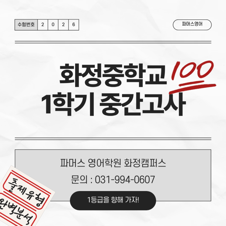 안녕하세요! 화정영어학원 파머스영어 화정캠퍼스입니다 오늘은 화정중학교 3학년 1학기 중간고사 영어시험을 분석해 드리겠습니다 먼저 솔직하게 말씀드리고 싶은 게 있어요 중학교 내신에서 가장 중요한 건 사실 '적중' 이 아닙니다 시험 범위가 교과서와 학교수업 프린트로 딱 정해져 있는 만큼 결국은 그 지문을 얼마나 꼼꼼히 분석하고 아이들이 충분히 연습할 수 있도록 만들어주느냐가 핵심이거든ㄷ요 요즘은 AI툴로 문제를 대량 생성하는 경우도 참 많습니다 양은 많지만 정작 시험에서 중요한 포인트를 놓치는 경우도 생각보다 흔해요 왜냐하면 AI로 돌려서 만드는 문제는 '고양화정중학교'의 맞춤이 아니고 전국에....... <img src="https://blogthumb.pstatic.net/MjAyNjA0MjhfODkg/MDAxNzc3MzQ5MTQzMzA4.FJDptuC3E-HZw0_m0Hz45TY_kHpB3FM737dmiMzTMCMg.mH1weMgM1uYO4IsrTJEpw2lm4z3P9OCBeM0DSzkGuQog.PNG/20260428-1.png?type=s3" />