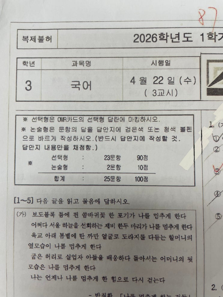 신일중학교 국어문제는 쉽지 않다. 대부분 중학교 문제가 비슷비슷하지만 신일중학교 국어문제는 작년에도 재작년에도 100점 맞기가 어렵다. 몇몇 문제는 함정이 있거나 깊숙한 이해력을 묻는 문제들이 있어서 특히 그렇다. 이번에 아이들이 많이 틀린 문제는 13번 문제이다. 정답은 ②번. <은행잎이 노랗다.>문장에서 주어가 생략되었다. ⑤에서는 <눈이 마을에 내린다>에서 부사어 ‘마을에’가 반복되어서 생략되었다. 9번 문제를 보면 보조사, 주격조사, 보격조사, 부사격조사, 서술어의 유형, 문장부사어, 성분부사어 등 품사와 문장성분 공부가 제대로 되어야 풀 수 있다. 공부를 한 학생들에게는 쉽다고 여길 수 있지만, 곳곳....... <img src="https://blogthumb.pstatic.net/MjAyNjA0MjVfMTcy/MDAxNzc3MTIxOTg1MDEw.xM7zkkqr4LWQ5vzPJGIfPUMZpihmjgZFU86z1BL8JAwg.MZPgRxx5HT_ovulB0i273IrT_yiEr-akvP6FFALzqPYg.JPEG/%BD%C5%C0%CF%C1%DF3_%BD%C3%C7%E8%C1%F6333.jpg?type=s3" />