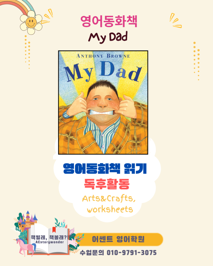 My Dad by Anthony Browne About the book and the Author My Dad는 아이가 자신의 아빠를 다양한 모습으로 표현하며 사랑과 자부심을 전달하는 이야기입니다. 이 책에서 아빠는 동물, 사물 등으로 비유되며 강하고, 빠르고, 다정한 존재로 그려집니다. “우리 아빠는 정말 최고예요!” 2. Before Reading 핵심 단어&표현들 익히기 *주요 어휘 및 표현* Family 가족 dad 아빠 Adjectives 형용사 strong 강한 brave 용감한 happy 행복한 kind 친절한 great 멋진 Animals 동물 (비유 표현) gorilla 고릴라 lion 사자 hippo 하마 owl 부엉이 *Useful Expressions* My dad is strong. (우리 아빠는 강해요.) My dad is as strong as a gorilla. (....... <img src="https://blogthumb.pstatic.net/MjAyNjA0MjZfMjY5/MDAxNzc3MTg1MDYzNDQw.w172dQiHvkuDhGVuyqko29jdhCZjqpPAGtnztuSYqP4g.4OAQarq0Xa9fCu2pzgC0Q4KBBJ7CZrltaW-0QSOAqdUg.PNG/1.png?type=s3" />