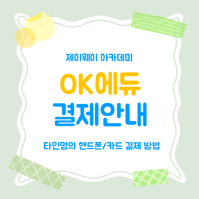 안녕하세요 제이웨이아카데미 입니다 저희 시스템의 변동이 있어 결제에 불편 느끼시는 학부모님들이 계셔 오늘은 바뀐 결제변경 방법에 대해 안내드리려 합니다 사진과 글을 잘 참고해 주세요! 목적 ) 에듀OK 에서 학원비 결제를 해야 할 때 카톡/결제 안내를 받은 '나'의 카드 가 아닌 배우자 혹은 다른 분 명의의 카드 로 원비수납을 원하시는 경우에 대한 안내 1) 이렇게 카톡 수납연락을 받으신 경우, 학원비 수납을 누르면 아래처럼 청구서 확인창이 나옵니다 여기서 원하는 결제 수단을 선택하시면 되요! 다만 원래는 이렇게 단순 결제를 진행할 경우 본인명의/ 알림을 받은 분의 명의로 된 카드로만 결제가 되지만, 내가 아닌....... <img src="https://blogthumb.pstatic.net/MjAyNjA0MjNfMzAw/MDAxNzc2OTI0NjI5MDA0.os9r_15ZVt1NNUOGEUCJmZBwmOGMhnYufWgkaRNd4pkg.FJ2bD9O3k8YMZ3ALgbgJKVvhrHmT_jNfUUpOceI7pV8g.PNG/image.png?type=s3" />