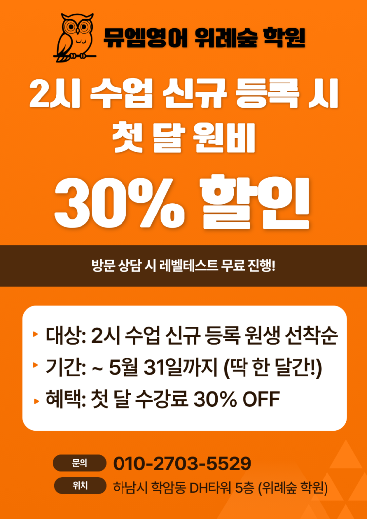따스한 5월, 우리 아이 영어 공부 시작은 언제 하면 좋을지 고민하고 계신가요? 학부모님들의 고민을 덜어드리기 위해 뮤엠영어 위례숲 학원에서 아주 특별한 이벤트를 준비했습니다!! "5월 딱 한 달간, 2시 수업 신규 등록 시 첫 달 수강료 30% 할인!" 영어는 시작이 중요합니다. 아이의 실력을 정확히 진단하고, 학습의 즐거움을 깨우쳐 주는 것이 첫 단추죠. 이번 기회에 우리 아이의 현재 영어 실력을 확인하고, 합리적인 비용으로 뮤엠영어의 체계적인 커리큘럼을 경험해 보세요! 이번 할인 혜택을 놓치지 마세요! 대상: 2시 수업 신규 등록 원생 (선착순 마감) 혜택: 첫 달 수강료 30% OFF 기간: ~ 5월 31일까지 (딱 한 달간....... <img src="https://blogthumb.pstatic.net/MjAyNjA0MzBfMTQ2/MDAxNzc3NTQyMTQ0OTE2.eKouobIdS5J0jjYrgg2ESggNjdF3NzOfR25-VyzyNREg.ektpHby_hxNyBXPiydnSlcrnI4Z3n6moesFZJWI42K4g.PNG/900_%C1%D6%C8%B2%BB%F6_%B9%E8%B0%E6_%C7%F6%B4%EB%C0%FB%C0%CE_%BF%B5%BE%EE_%B5%B6%BC%AD_%C7%D0%BF%F8_%C0%FC%B4%DC%C1%F6_20260430_183617_0000.png?type=s3" />